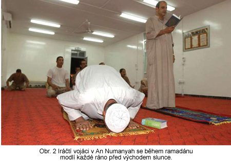 Obr. 2 Iráčtí vojáci v An Numanyah se během ramadánu modlí každé ráno před východem slunce.