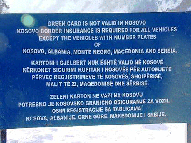 Na území Kosova neplatí mezinárodní osvědčení o platnosti pojištění odpovědnosti za škodu způsobenou provozem konkrétního vozidla (tzv. zelená karta). Proto je třeba před vstupem do Kosova zaplatit hraniční pojištění vozidel, které případné způsobené škody uhradí.