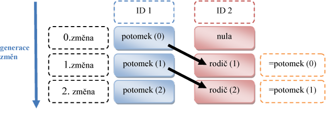 Vhodným řešením, jak udržet kontinuitu historické báze dat (např. číselník dat), je sledování postupných změn. V jednotlivých generacích úprav se k novým záznamům přidá odkaz na předchozí stav (rodiče) a rodičovskému záznamu se přidá odkaz na nový záznam (potomka). Celý algoritmus je přehledněji znázorněn na schématu č. 2.