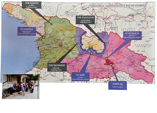 Před odletem jsem měl jen kusé informace o této misi, respektive o lokalitách, kde byly rozmístěny polní kanceláře EUMM (Field Office - FO) a podmínkách v nich. V době mého nástupu byly kromě velitelství EUMM (Headquarters - HQ EUMM) v Tbilisi v činnosti celkem 4 polní kanceláře, a to v Mtskhetě, Gori, Khashuri a Zugdidi, přičemž posledně jmenovaná se stalo mým působištěm.