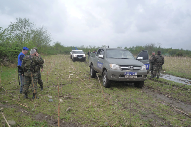 Tým ECHO. V říjnu 2009 jsem přešel na vlastní žádost do týmu ECHO, kde jsem mohl více uplatnit svoje vojenské zkušenosti a kde jsem plnil úkoly pozorovatele a velitele patroly. Náplní práce v tomto týmu byla kontrola režimu na hranici s Abcházií (Administrative Border Line - ABL), jejíž celková délka činila od pobřeží Černého moře po Kavkaz 172 km, z toho bylo denně kontrolováno 80 km ABL (od pobřeží Černého moře až po přehradu JVARI), část této hranice tvořila druhá největší gruzínská řeka ENGURI. Patrolování bylo prováděno pouze na území Gruzie (Tbilisi Administrative Territory - TAT), mandát mise EUMM neumožňoval vstup na abcházské území. ABL byla ze strany Abcházie zpočátku střežena příslušníky abcházské milice, později byla vystřídána příslušníky ruských pohraničních sil. Naše patroly byly organizovány 2krát až 3krát denně v počtu 2 ve složení 2 vozidla EUMM + 1 sanita s lékařem jako doprovod. Foto č. 4 Na patrole....