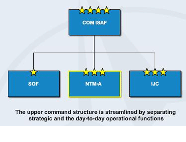 Velitelství ISAF v roce 2010 z důvodu zefektivnění svojí činnosti změnilo svoji organizační strukturu. Cílem této změny bylo lepší propojení velitelských složek, tím že došlo k oddělení strategických a každodenních operačních funkcí velitelství ISAF. Velitelská struktura sestává z vyššího strategického velitelství, ISAF HQ, kterému velí čtyřhvězdičkový generál, a ze dvou tříhvězdičkových (operačních) velitelství IJC (ISAF Joint Command) HQ a velitelství NTM-A (NATO Training Mission). Všechna tato velitelství jsou situována v Kábulu a velitel ISAF HQ je zároveň velitelem speciálních sil SOF. [2]