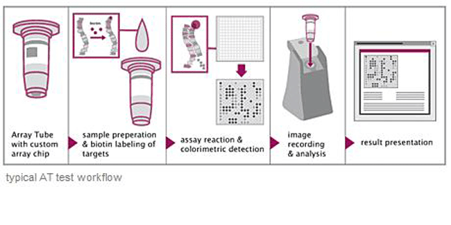 Proteinový ,,čip"ArrayTube [12, 13] od společnosti Clondiag je v podstatě mnohakanálový imunosensor s optickým vyhodnocením signálu pomocí CCD detektoru. Jedná se o sendvičové imunostanovení s křenovou peroxidázou (HRP) jako značkou a precipitujícím substrátem, kdy je použita mikrozkumavka, v jejímž dnu je umístěn multispot se souborem imobilizovaných protilátek. Jedním stanovením lze detekovat pět BA současně při době stanovení 90 min (obr. 4).