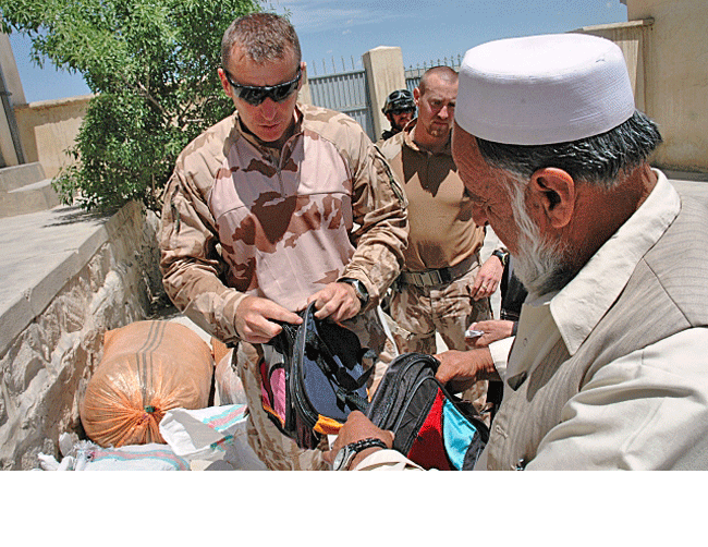 Obrázek č. 8 Specialista CIMIC/PsyOp při předání školního vybavení a pomůcek řediteli školy v rámci realizace projektu QIP. (Pramen: vlastní)