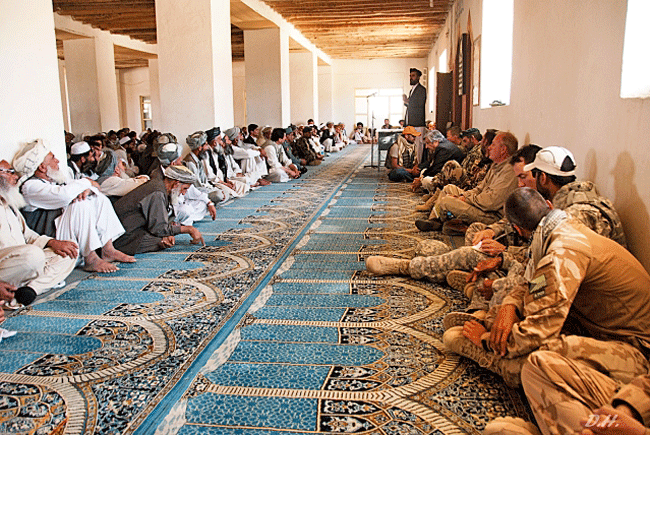 Obrázek č. 7 Komunitní sněm (šura) po ukončení kinetických operací v zájmové oblasti. Cílem sněmu je obnovení důvěry a civilně-vojenských vztahů s populací a kmenovou samosprávou. (Pramen: Daniel Hlaváč, 2011)