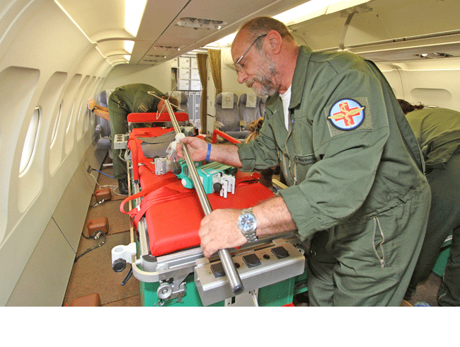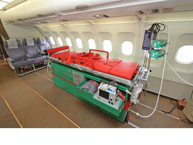Zdravotnická zástavba je daná výrobcem letounů, pro Airbus A-319CJ jsou 4 certifikované varianty interiéru. Na palubě letounu je potřebné množství zdravotnického i nezdravotnického vybavení a materiál odpovídající typu požadované léčby v souvislosti i s počtem repatriovaných zraněných.