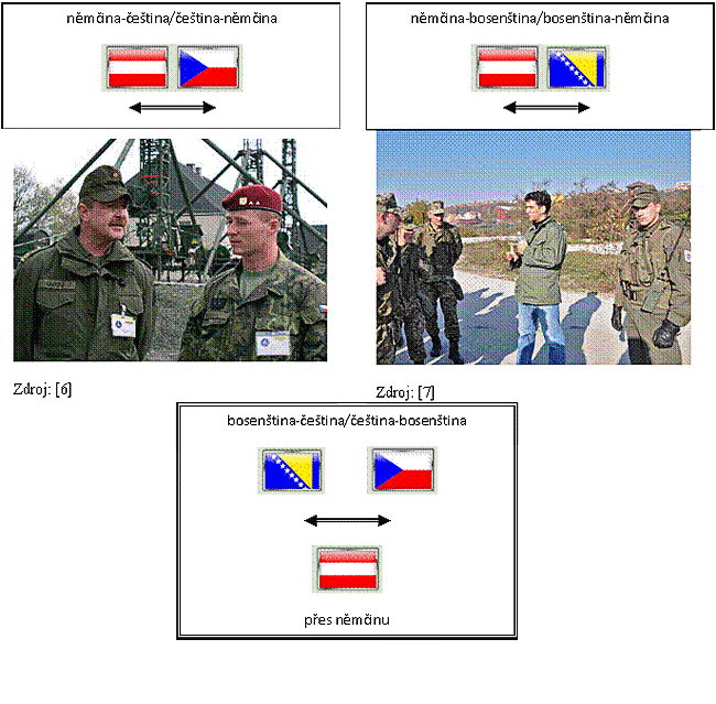 Příkladem výše uvedeného může být mezinárodní cvičení specialistů chemických odborností, které se pravidelně koná ve Vyškově. Ve skutečnosti se jedná o spolupráci vojenských profesionálů z Rakouska, Polska a z Bosny v areálu kasáren ve Vyškově a na chemickém cvičišti Kamenná chaloupka. Jednacím jazykem je samozřejmě angličtina - ale s českým personálem se jedná i v češtině, v němčině i jiných jazycích. Právě proto, že spolupracují vojáci z více než dvou států, situace si vyžaduje komunikaci ve více jazycích.