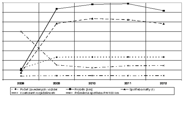 Z grafu 1 je patrné, že proběh v kilometrech se roce 2011 ustálil. V roce 2011 bylo ujeto o 209 012 km více než v roce 2012. Na tomto základě lze předpokládat, že provoz v roce 2013 nebude pravděpodobně vyšší než v roce 2011.