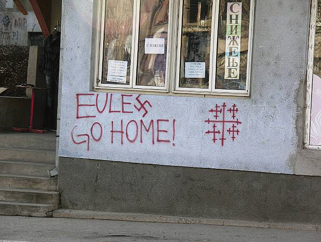 EULEX běžte domů. Podobné nápisy, vyjadřující vnímání této mise místními obyvateli, jsou na severu Kosova k vidění na mnoha místech