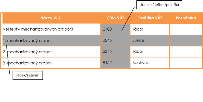 | Sloupec (položka, atribut) | V záhlaví tabulky (první řádek tabulky) je jednoznačně uvedeno, jaký atribut vyjadřuje (popisuje) - na příkladu VÚZ jsou to: ,,název VÚZ", ,,číslo VÚZ", ,,posádka VÚZ" a další, např. ,,nezbytná" ,,poznámka". |