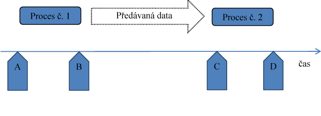 Jako příklad lze uvést dva závislé procesy, které sdílejí stejný číselník (schéma č. 1). V rezortu obrany ČR může jít například o proces plánování a rozpočtování, investiční a akviziční procesy nebo výstavbu sil a evidenci personálu. Pokud na časové ose je proces č. 1 ohraničen mezi body A-B a proces č. 2 mezi body C-D, v období B-C dochází k předávání, verifikaci (možná i restrukturace) a přípravě k použití dalšího, navazujícího procesu.