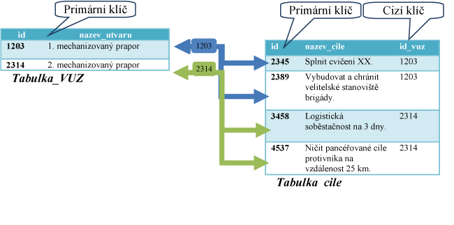 Na schématu č. 3 je zřejmá vazba 1:N mezi jednotlivými záznamy v tabulkách podle jednotlivých klíčů (primárních a cizích). Jeden útvar má tak přidělen pomocí vazby mezi tabulkami jeden a více cílů.