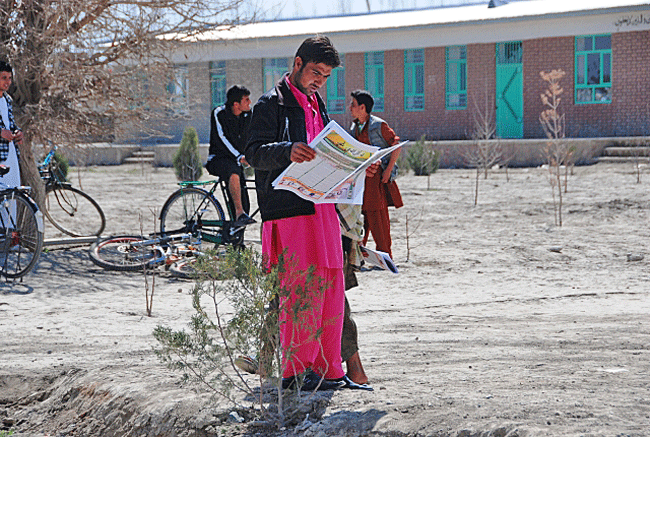 Obrázek č. 20 Student střední školy zaujatý četbou novin Sada-e Azady (Hlas svobody) distribuovaných na celém území Afghánistánu taktickými týmy PsyOp. (Pramen: vlastní)