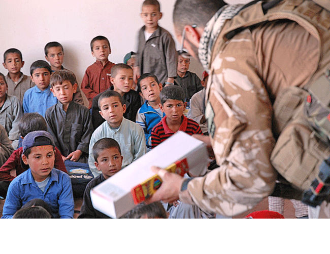 Obrázek č. 9 Specialista CIMIC při přímé distribuci školních pomůcek ve vesnické chlapecké jednotřídce. (Pramen: Daniel Hlaváč, 2011)