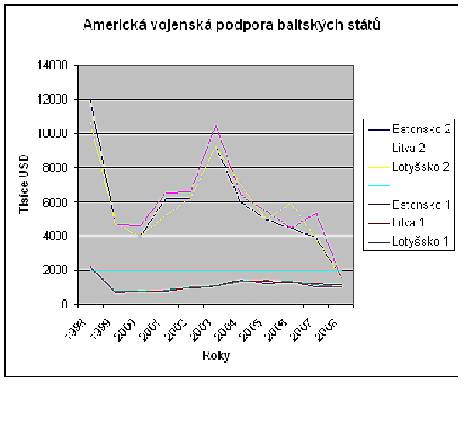 Na obrázku č. 2 je uvedena americká finanční podpora ozbrojených sil baltských států. Spodní tři křivky (Lotyšsko 1, Litva 1 a Estonsko 1) ukazují americkou podporu v rámci mezinárodního programu pro vzdělávání a výcvik. Vrchní křivky (Lotyšsko 2, Litva 2 a Estonsko 2) ukazují finanční podporu prostřednictvím programu pro financování zahraničních armád. Zajímavá je výrazná finanční podpora baltských států v 90. letech. To vyplývá ze situace, kdy baltské státy začaly s výstavbou vlastních ozbrojených sil a tedy potřebovaly nejvíce finančních prostředků na počáteční investice. Spojené státy se zde ukázaly jako významný spojenec. Otázkou zůstává možnost odrazu vztahů Spojených států s Ruskou federací do americké ekonomické pomoci. Nebylo by to poprvé, kdy se Spojené státy snaží upevnit svůj vliv prostřednictvím finanční pomoci určitému státu. Americká pomoc byla největší v době 90. let, tedy v období striktního ruského odporu vůči rozšiřování NATO a militarizace Kaliningradu v polovině 90. let. Pokles této pomoci koncem 90. let by mohl korespondovat s opětovnou demilitarizací a zlepšováním ruských vztahů se západem. Významný vzestup americké pomoci po roce 2000 až do vlastního vstupu těchto zemí do NATO v roce 2004 odpovídá snaze připravit jejich ozbrojené síly na vstupní proces. Následný pokles už ukazuje na stabilizaci situace a na přenechání větší odpovědnosti na samotných baltských státech.